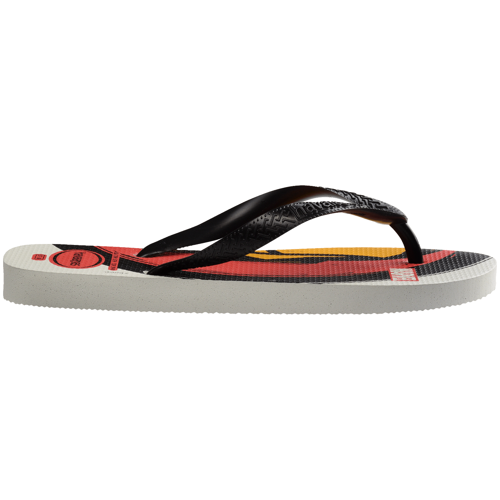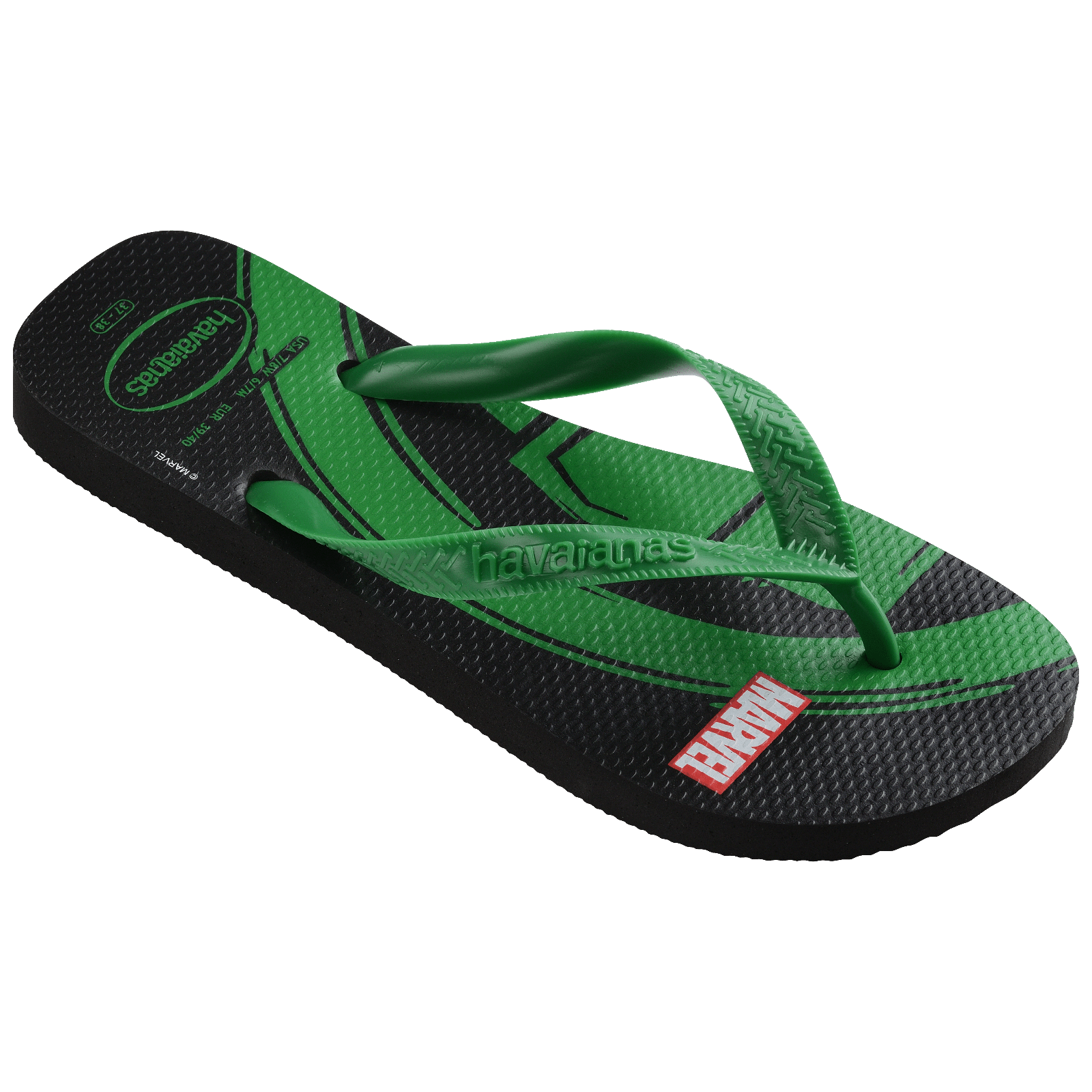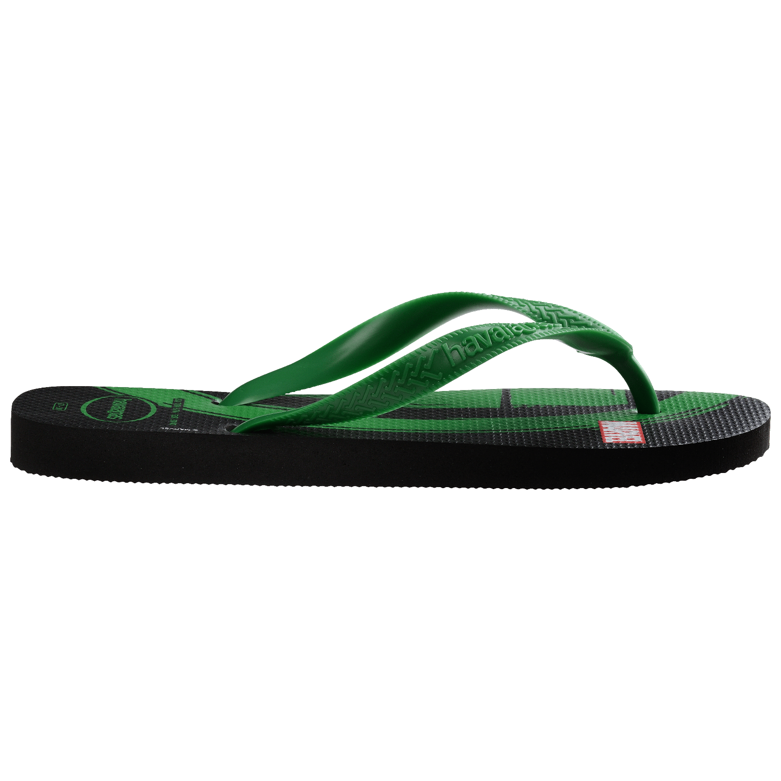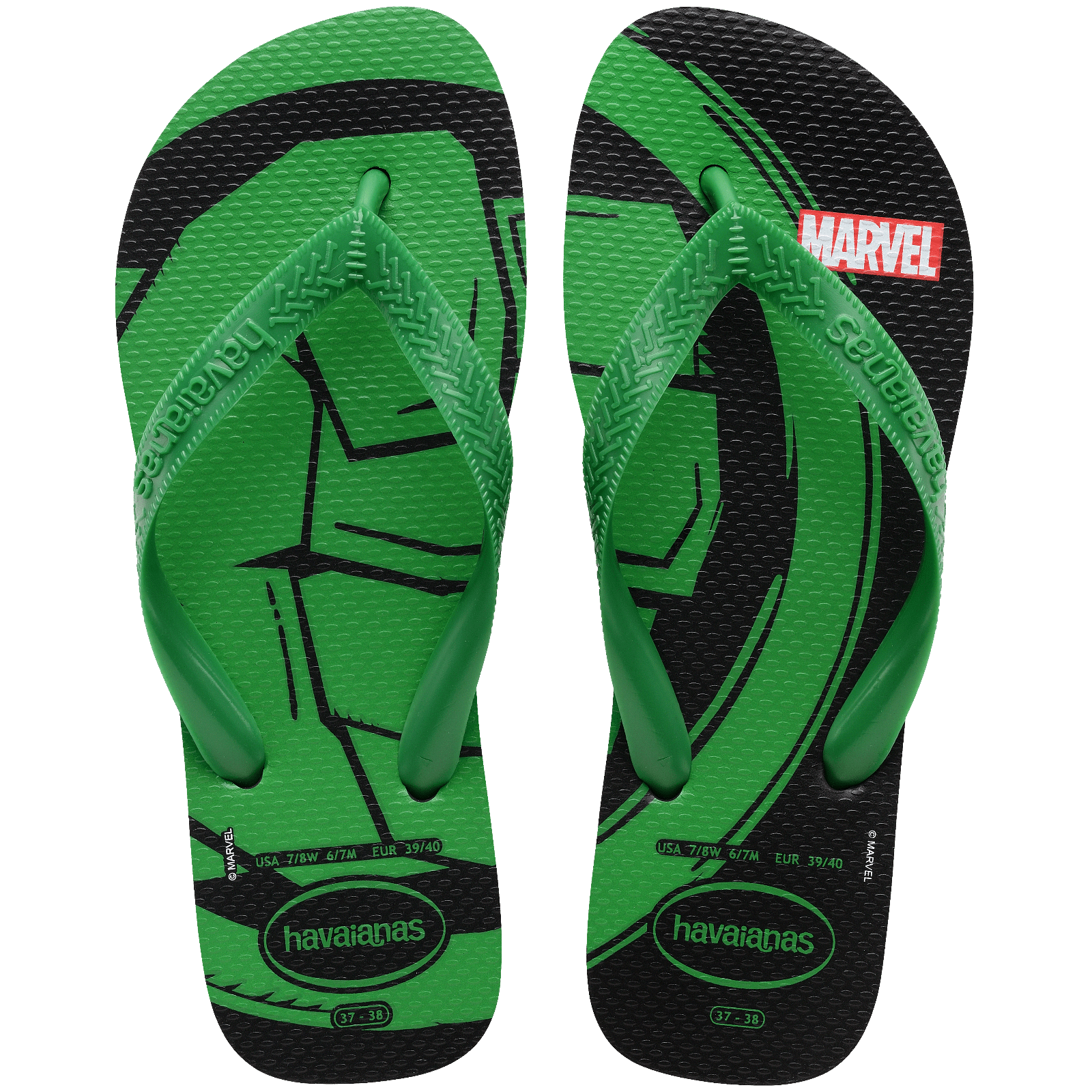 Los superhéroes de Marvel tienen características inconfundibles. Las Havaianas Top Marvel Logomania tienen suelas estampadas precisamente con estas representaciones icónicas: una mano verde (Hulk), un casco (Iron Man) y una máscara (Spider-Man). ¡Una sandalia poderosa!